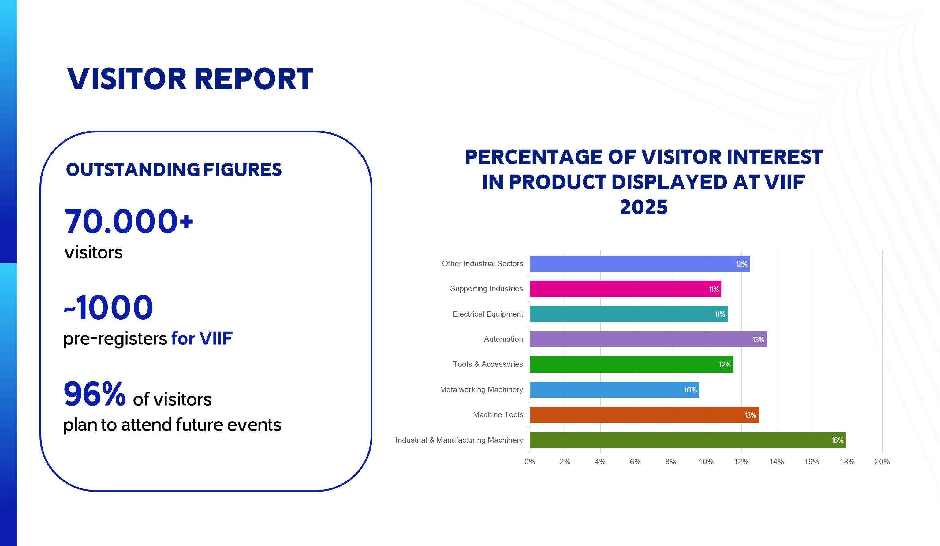 2025年第31届越南工博会VIIF展览面积达4万平方米,设有机床智能装备馆、五金机电馆、工业配套产品馆、交通轨交技术馆及工业科技供应链馆四大主题馆,并举办了越南工业4.0数智创新峰会、越南工业机床商务对接会、越南工业品国际供应链对接采购会、越南国际铁路轨交工程基建供应链峰会等活动。展期共吸引430多家越南本土企业及190多家来自中国、德国、日本、韩国、瑞士、奥地利、泰国、马来西亚等12个国家和地区的制造业及工业配套企业参展,接待专业买家和观众约25000人次。在参展企业方面,除越南VinFast(VINGROUP)、HOA PHAT集团等大牌企业,还有来自德国企业商会、德国大众、日本日立/雅马哈、韩国现代、中国徐工集团、中铁集团、今一、杰瑞、创轩激光、宏创等品牌联袂参展。展会为参展商与国内外企业开展技术交流、商贸合作提供了巨大的机遇平台,为越南工业4.0高质量发展提供了智能制造多渠道解决方案。