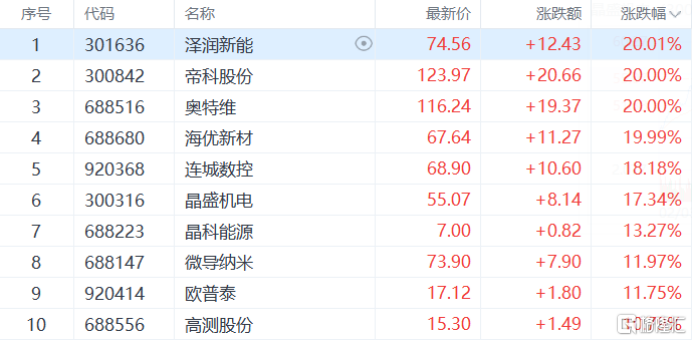 盘面上,光伏、BC电池板块爆发,泽润新能、帝科股份等多股涨停;船舶制造板块走高,海兰信涨超15%;CPO概念活跃,天通股份等多股涨停;小金属股拉升,东方钽业涨停;商业航天板块走强,神剑股份等多股涨停;激光雷达、蓝宝石、大飞机、工程机械及航母概念等涨幅居前。另外,银行、保险及酿酒行业等少数板块录得下跌。