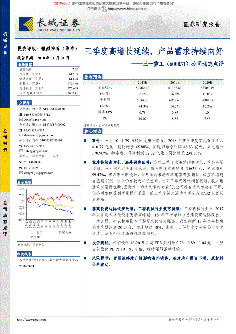 公司挖机龙头地位稳固,前三季度挖机销量35627台,同比增长59.47%,市占率不断提升。全年国内市场泵车销售有望翻番,起重机增速有望超70%,未来仍有较大成长空间。公司三季度海外销售提速,收入增速恢复至两位数。因海外市场毛利率相对较低,公司综合毛利率略有下降,但公司整体盈利质量提升显著,前三季度经营活动净现金流87.32亿创历史新高。基建投资边际逐步改善,工程机械行业复苏持续:工程机械行业自2017年以来进入存量设备更新高峰期,18年下半年以来基建投资边际改善,市政工程、新农村建设等下游需求仍较为旺盛,我们判断18年全年挖机销量有望达到20万台,增速超过40%,未来1-2年行业复苏趋势大概率延续,龙头企业业绩将持续超预期。投资建议:我们预计18-20年公司EPS分别为0.78、0.89、1.04元,对应当前股价PE为10、9、8倍,维持强烈推荐评级。