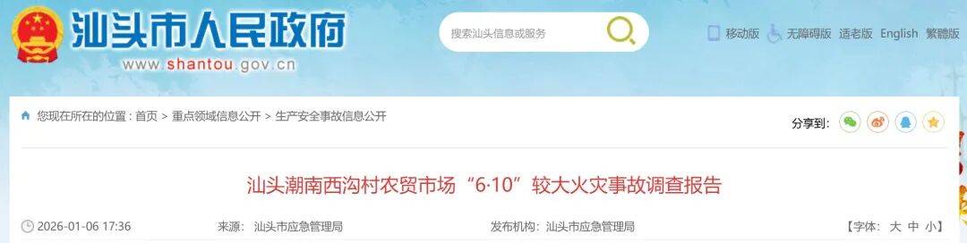1月6日,广东省汕头市人民政府门户网站公布了《汕头潮南西沟村农贸市场“6·10”较大火灾事故调查报告》。经调查认定,该事故为一起因电气线路故障引燃周边可燃物导致的较大生产安全责任事故。