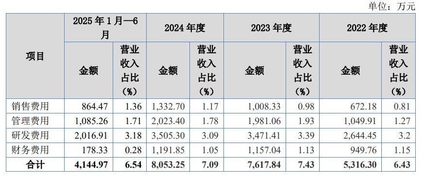 报告期各期,公司期间费用合计分别为5,316.30万元、7,617.84万元、8,053.25万元和4,144.97万元,随着公司生产经营规模的扩大而相应上升,期间费用占当期营业收入的比例分别为6.43%、7.43%、7.09%和6.54%,与公司业务规模相匹配。