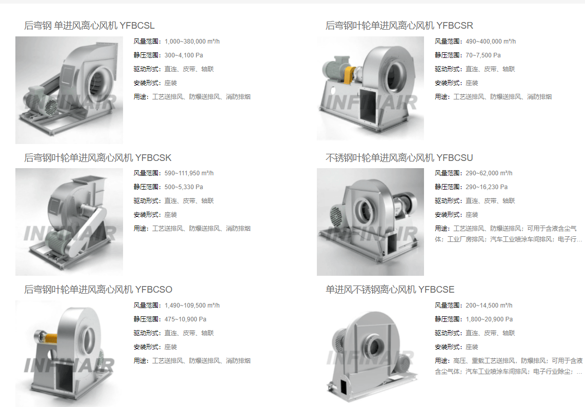 英飞工业风机凭借全系列覆盖、多工况适配、高可靠性的优势,全方位满足各类工况需求,为工业通风提供高效、稳定、灵活的系统化解决方案,助力企业实现可靠与节能并行。产品矩阵包括:中低压离心风机(YFBCSL/YFBCSR/YFBCSK)、高压/超高压离心风机(YFBCSU/YFBCSO/YFFCSE/YFBCSC/YFFCSC)、防腐风机(BCSF)、双进风风机(YFBCDL)、嵌入式风机(YFBCQQ)、插入式风机(YFBCPL),满足各种工况需求,兼顾效率与节能。广泛的行业应用: