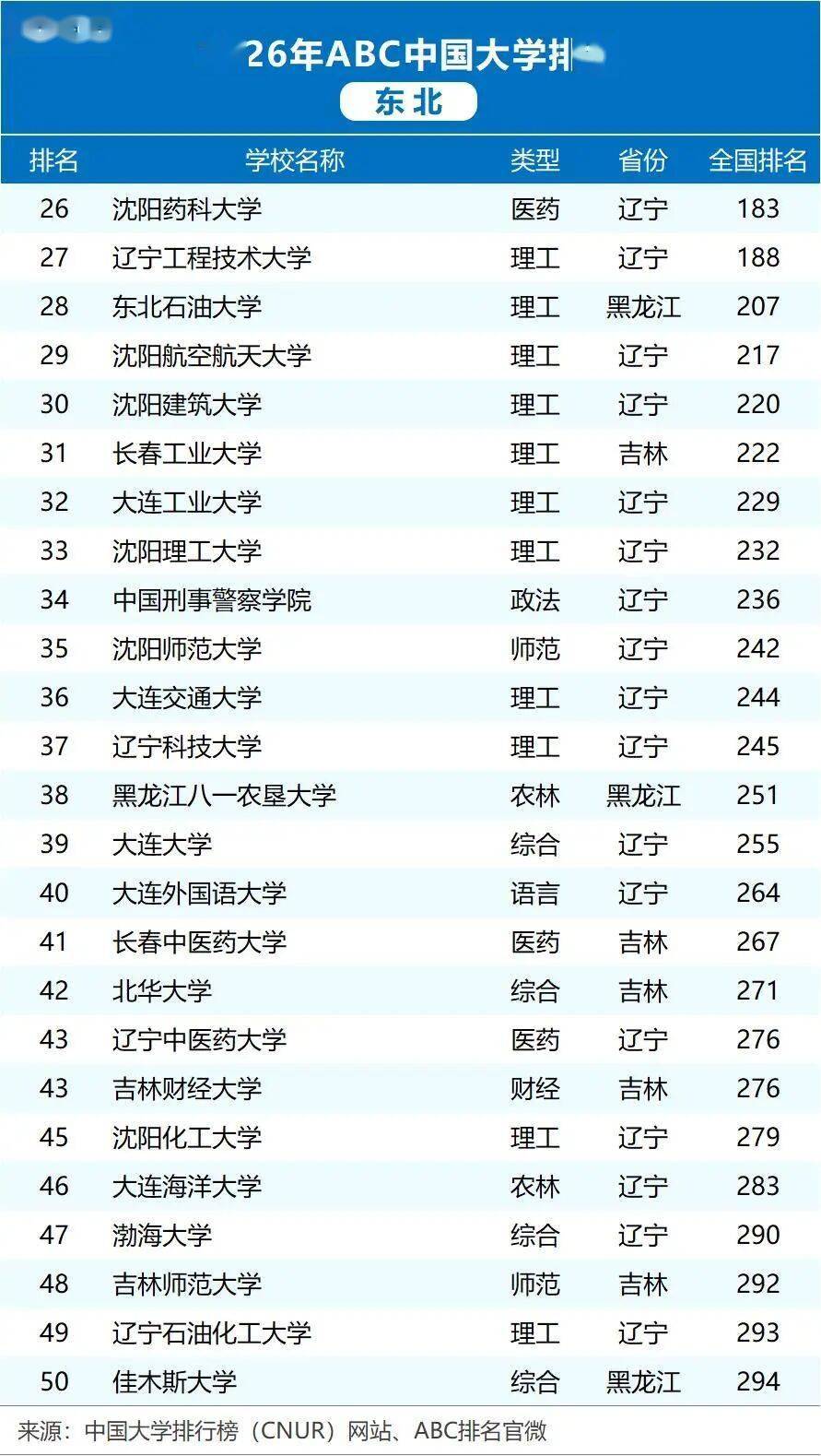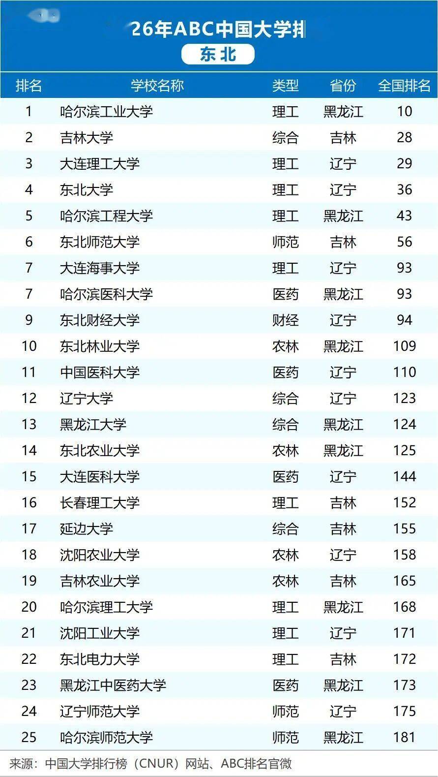 2026年ABC中国大学排名中,东北地区表现出色,共94所公大学上榜,其中,9所大学入围全国100强,27所大学入围全国200强。