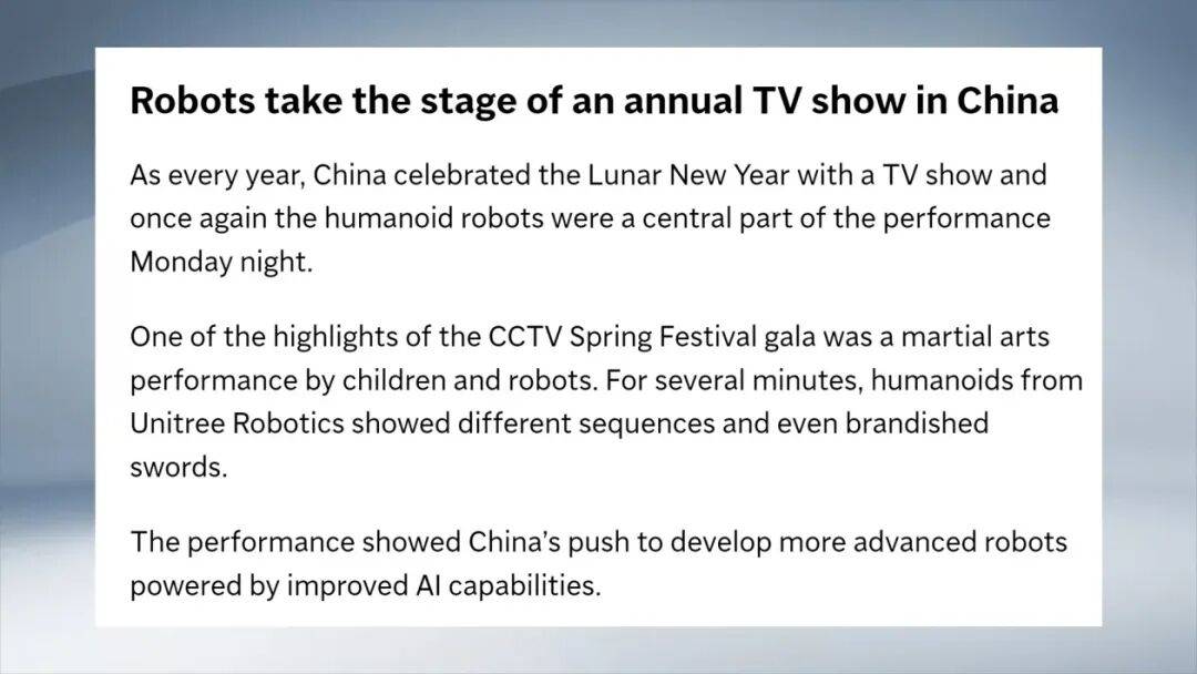今年的总台春晚上,人形机器人的精彩表演令人印象深刻,多家国际媒体也惊叹中国在人形机器人以及人工智能领域的飞速发展。